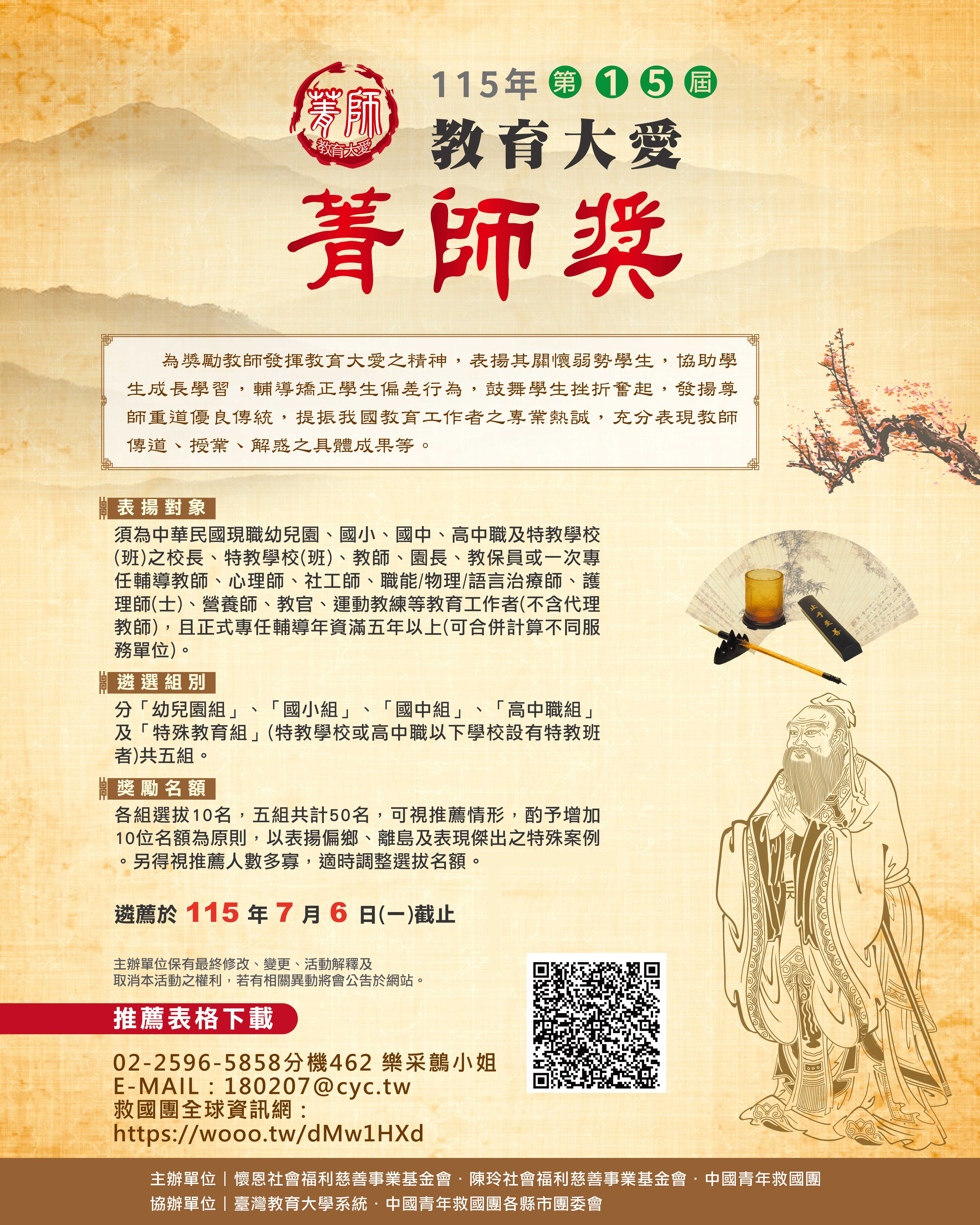 115年第15屆教育大愛菁師獎遴選辦法、推薦表、個人檢核表等